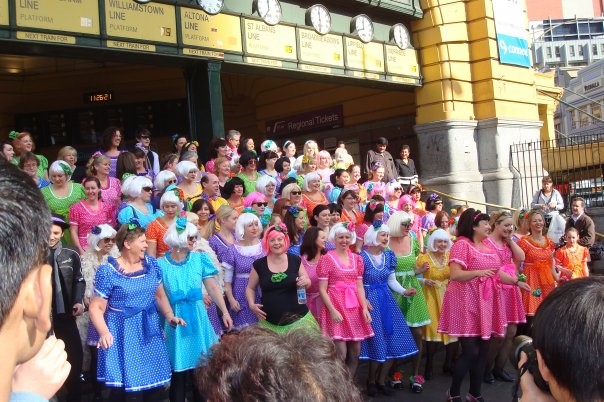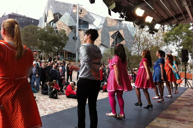 Tap Dancing March o'Glamour across Princes Bridge to Flinders Street Station. to Federation Square. Shim Sham Shimmy on the steps of Flinders street Station - on to Free Tap Performance at Federation Square with historical tap footage projected on the big screen.