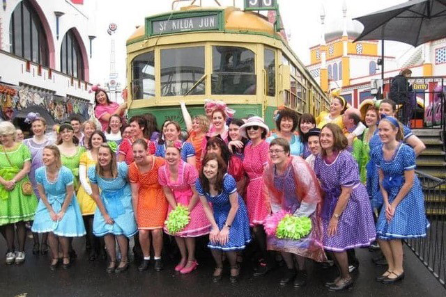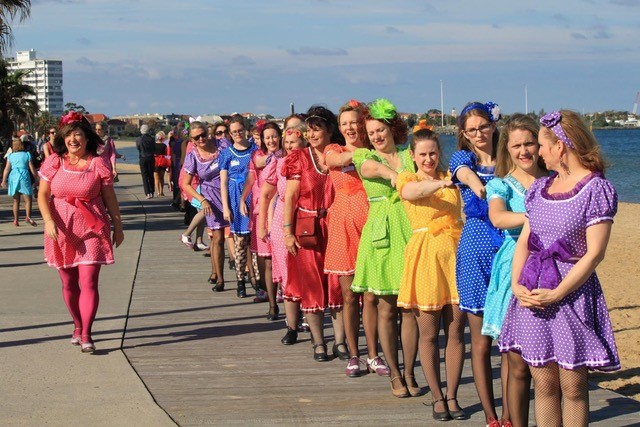 March o' Glamour from the St Kilda baths along The Esplanade to Luna Park. Shim Sham Shimmy at Luna Park. On to free tap performance at The Palais Theatre forecourt.