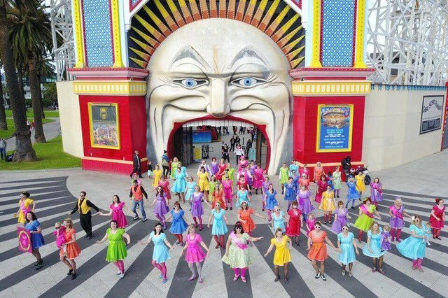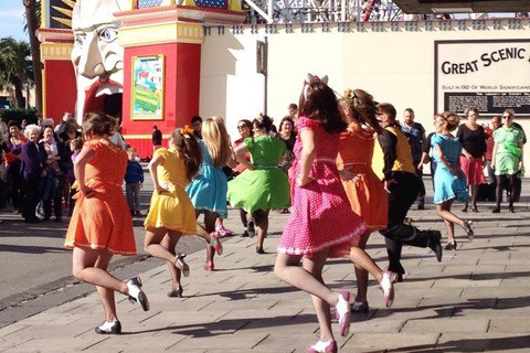 Shim Sham Shimmy on St Kilda Pier. Tap Dancing March o'Glamour across The Esplanade Foot Bridge to Luna Park. Free Tap Performance inside Luna Park.