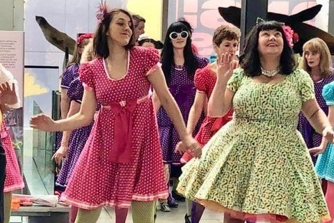 March o'Glamour through The Carlton Gardens. Shim Sham Shimmy in The Royal Exhibition Building forecourt. On to a free tap performance inside Melbourne Museum